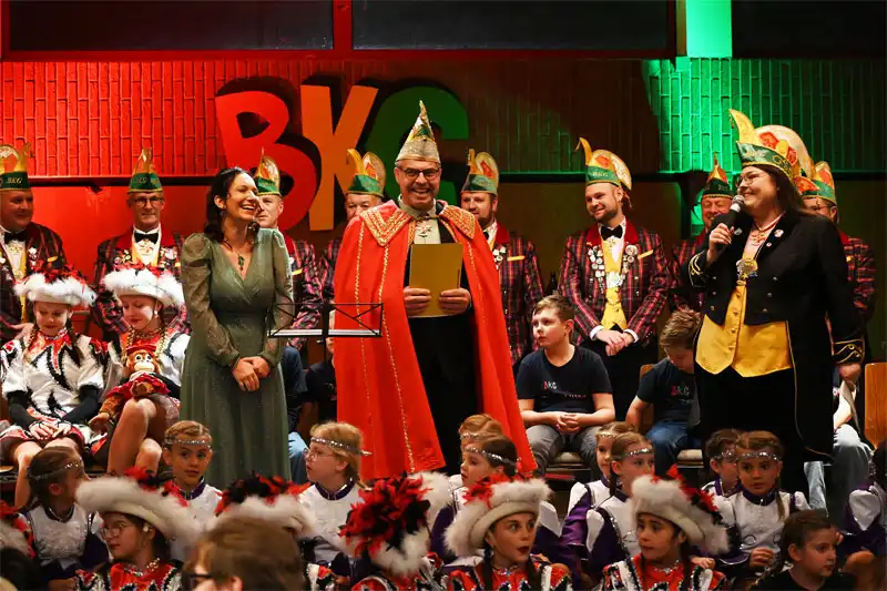 In Vertretung für den ebenfalls erkrankten Stadtbürgermeister Günther Jung überreichte der 1. Beigeordnete der Stadt, Christian Flohr, symbolisch den Stadtschlüssel an die neuen Regenten. Scherzhaft bescheinigte er der BKG eine tolle Wahl, sei der Verein doch mit seinem „recycelten“ Prinzenpaar offenbar um Nachhaltigkeit bemüht und habe mit der Wahl des Prinzen, hauptberuflich Landschaftsgärtner, noch dazu jemanden ausgesucht, der sich bestens mit dem Kompostieren auskenne.